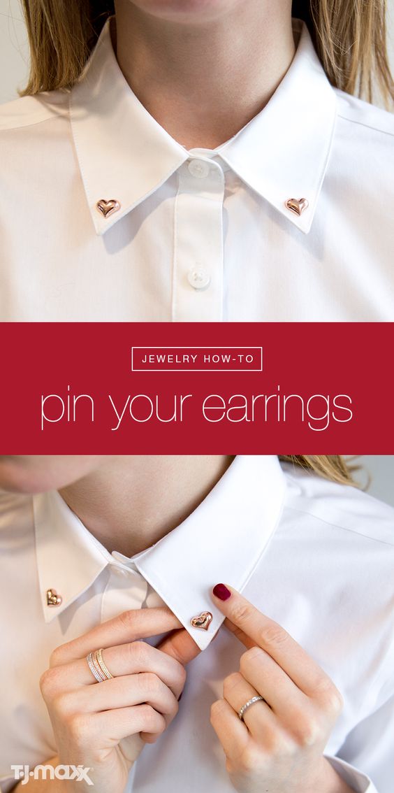 I love this idea of using post earrings as accents for your button down shirts. The idea originated on TJ Maxx’s website, but doesn’t really require any explanation, just pin a pair of posts to your collar. Easy and different!